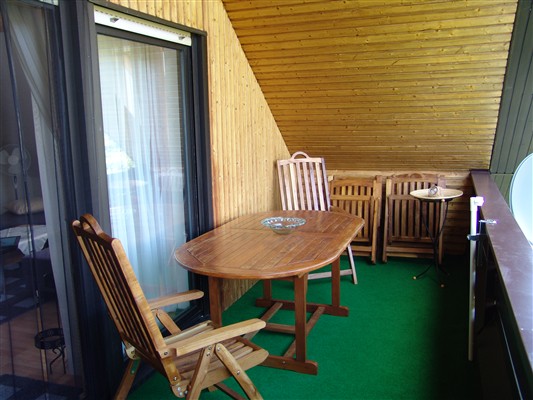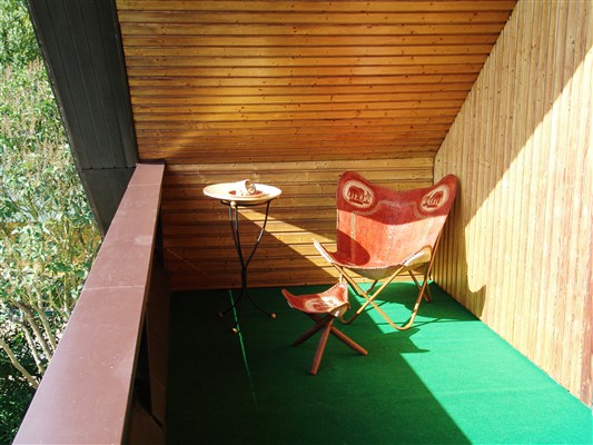 Auf dem großen Balkon können Sie auf gemütlichen mit Sitzpolstern und Sonnenschirm ausgestatteten massiven Teakholzmöbeln das Frühstück in der Morgensonne mit einem wunderschönen unverbauten Ausblick in die Natur genießen.