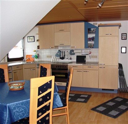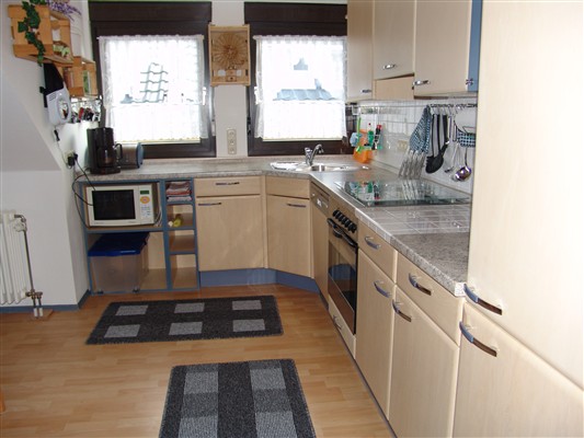 Die großzügige Küche in L- Form enthält Zeranfeld mit Backofen, Geschirrspüler, Kühl-/Gefrierkombination, Mikrowelle und alle elektrischen Kleingeräte wie Kaffeemaschine, Toaster, Sandwichmaker, Handmixer, Eierkocher, Wasserkocher und Allesschneider uvm. Selbstverständlich werden Ihnen auch hier Haushaltsutensilien wie Spül- und Putzmittlel, Filtertüten, Geschirrhandtücher, Zewarolle usw. zur Verfügung gestellt. Ein großzügiger Eßbereich sorgt dafür, dass Sie sich auch gerne einmal Gäste mit einladen können.